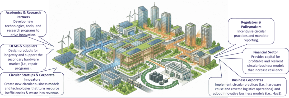 While hyperscalers like Microsoft and AWS are establishing internal circular centres to achieve high reuse targets, the open market remains fragmented. The next evolution involves innovative business models that decouple revenue from resource use. Examples include: